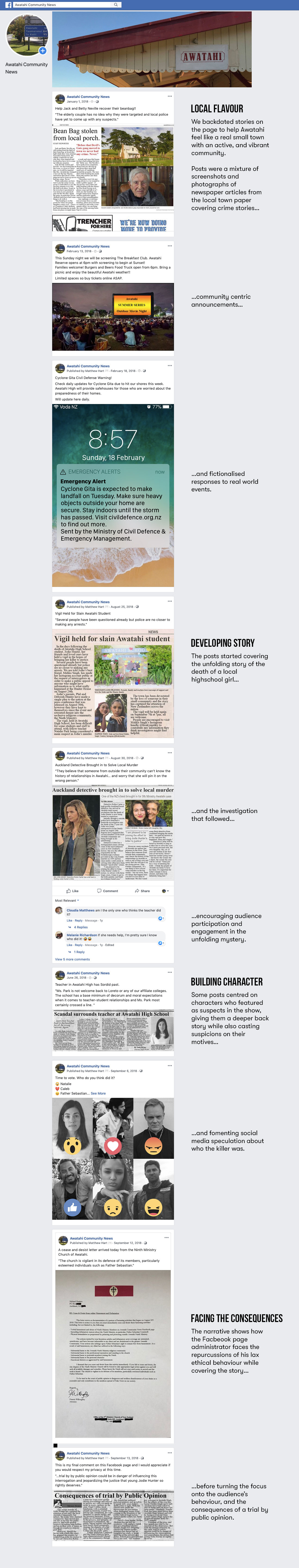 A transmedia social media was developed in collaboration with the show runners. This was essential in order to produce a Facebook page for the fictional town of Awatahi - the setting where the story of Alibi takes place.