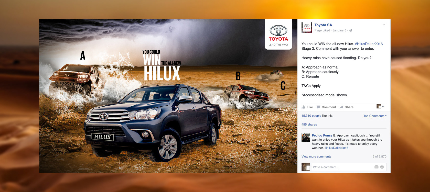 On Facebook, for each of the 13 stages we published posts with specific details about obstacles that the Hilux team would face each day. Fans were presented with these obstacles which they could then choose how to overcome. By commenting their choice (A, B, or C), fans were entered into the competition.