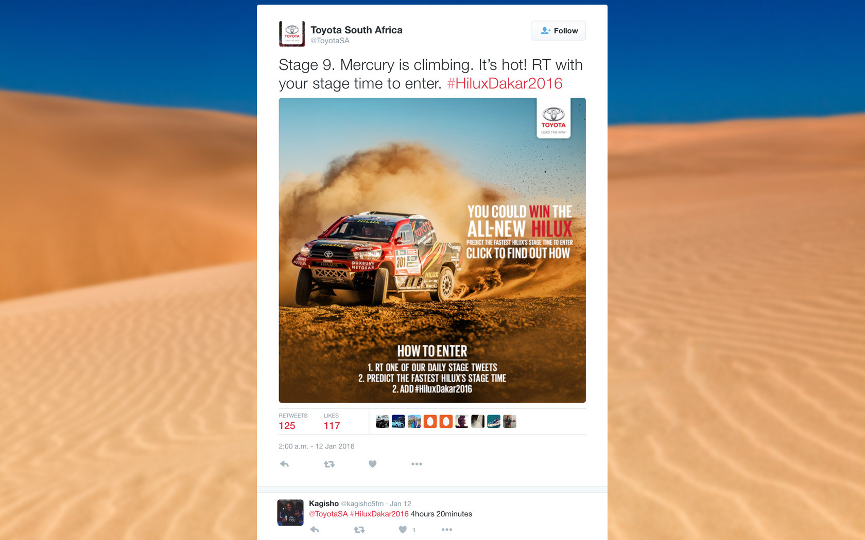 On Twitter we tapped the armchair experts again by asking for their race predictions. For each stage we tweeted course information and in order to enter, fans would reply with their stage time prediction for the Hilux team.