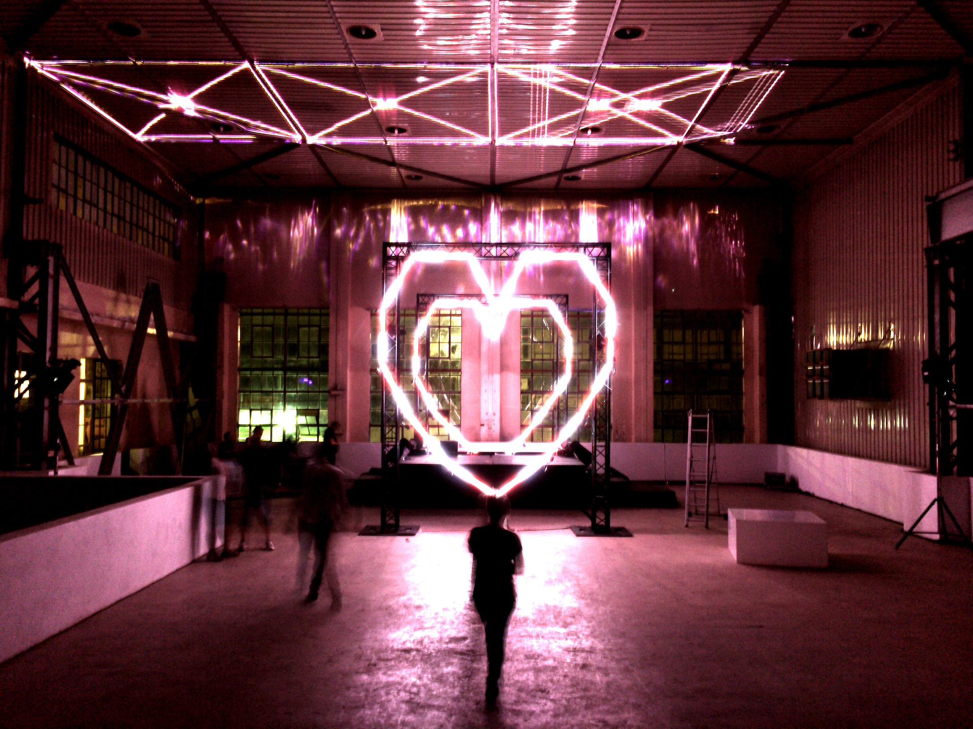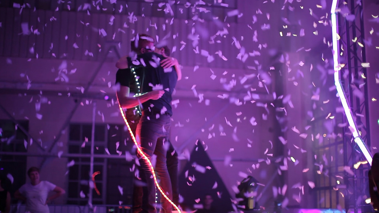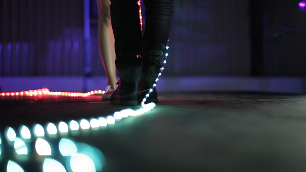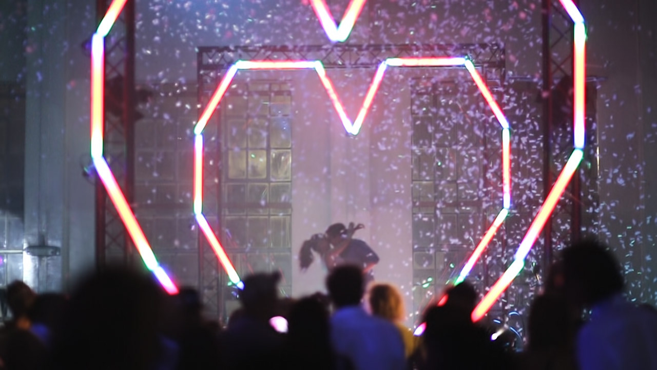 At a Valentine's Day event in Johannesburg's inner-city Maboneng District we built a kiss activated installation on a stage framed by 10-foot hearts made of lights. Two people walked onto stage, each holding a conductive rope light. When the couple's lips touched, their bodies completed a circuit which was read by a microcontroller and the signal was amplified to trigger a lighting desk that controlled the giant heart lights, a laser display, a confetti cannon and the other display lights on the stage.